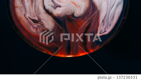 Paint defocused texture. Round space glow. White marble liquid spreading on orange abstract glitter. Blur arch lens color frame black background.