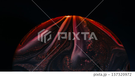 Ink defocused spread. Curve glow. Black red orange pigment spill on blur round frame. Colorful abstract leak swirl dark background.
