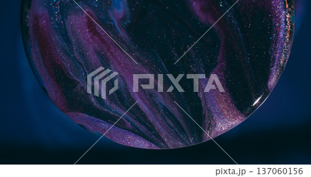 Blur paint blend. Fluorescent curve. Black purple violet sparkling emulsion in circle lens. Swirl flow spilling on color abstract background.