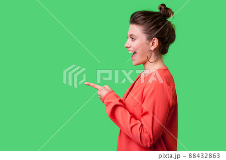 Hey you. Side view portrait of amazed girl with bun hairstyle, big earrings and in red blouse pointing finger to the left, looking with astonishment. indoor studio shot isolated on green background