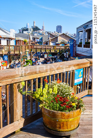 Deck with assorted colorful flowers in barrel on Pier 39 with distant Coit Tower