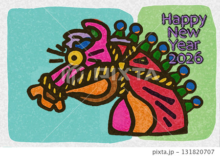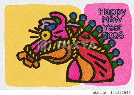 年賀状 アート カラフル happyNewYear 2026年 令和8年 ピカソ的 黄地