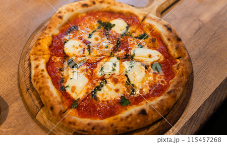 Neapolitan pizza close-up, delicious fresh pizza on a wooden table