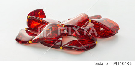 Transparent polished beads of red amber on a white background. Sun stone. Natural mineral material for jewelry. Amber texture. Copal. Ancient fossil resin