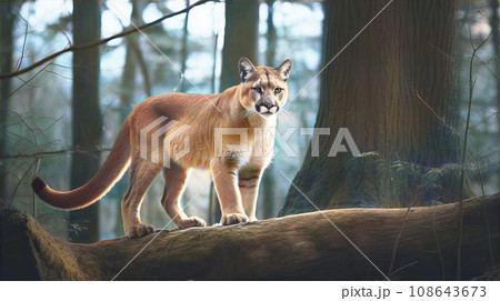 Portrait of a cougar, mountain lion, puma, panther, striking a pose, Winter scene in the woods, wildlife America