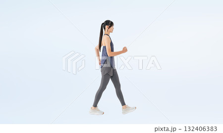 ウォーキングするスポーツウェアの女性の全身写真