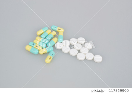 a pills and capsules on a white