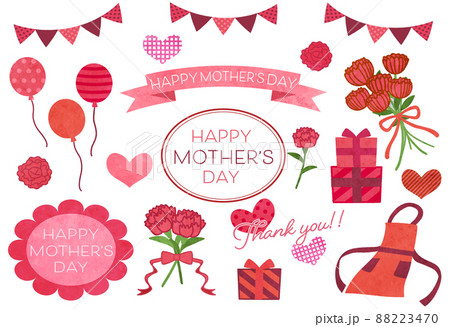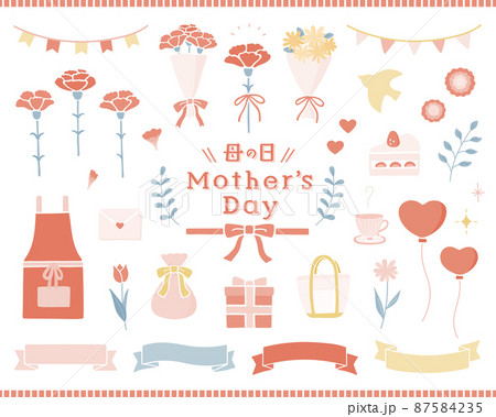 母の日のイラストセット。カーネーションや薔薇の花、リボンの飾り素材。女性物のバッグや靴、化粧品やエプ