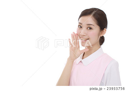 白いシャツとソフトピンクのエプロンを着た明るい若い女性