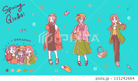 シンプルかわいい手書きの春コーデ女子たちのイラスト素材