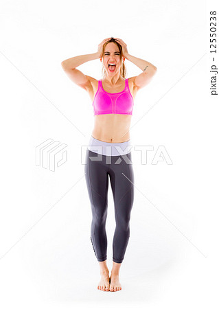 model isolated on plain background stressed upset pulling hairs
