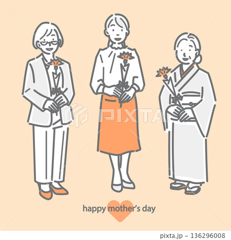 カーネーションを持ついろいろな世代のお母さん 母の日 シンプルでお洒落な線画イラスト