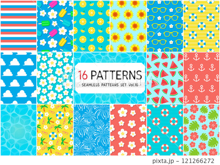 16種類の夏のイラストパターンセット(背景色は変更可)