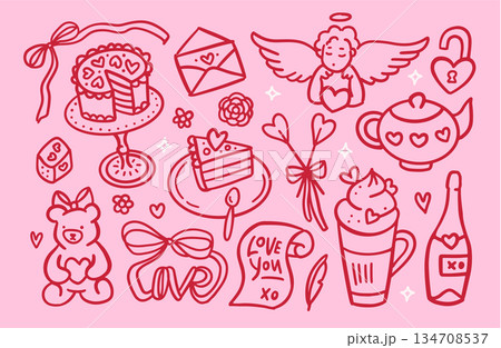 Freehand drawing Valentines Day collection of romantic elements. Red and pink coquette vintage vector illustration of teddy bear, cake, love letter, beverages, bows etc. Design for posters, cards