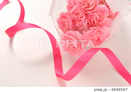リボン・濃いピンクカーネーションの花束(コピースペース・人物なし・シンプル)