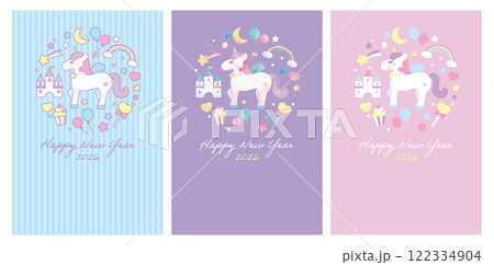 ユニコーン。ゆめかわ、ガーリーなパステルトーンのイラスト素材。ベクターイラスト素材。