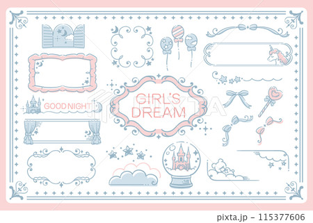 ゆめかわ、ガーリーなパステルトーンのイラスト素材。フレームやコーナーも。ベクターイラスト素材。