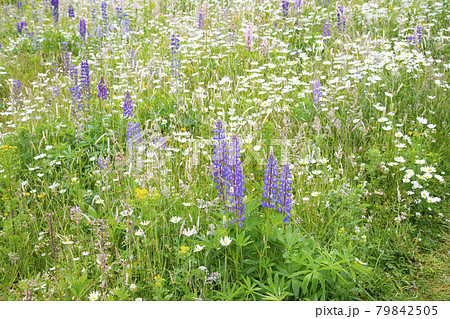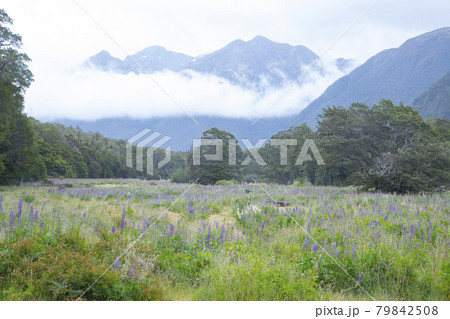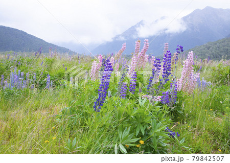 ニュージーランド カスケードクリーク ヒストリックキャンプサイト ルピナスの花畑