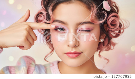 ウィンクするキュートでガーリーなピンクメイクの若い女性(AI生成画像)