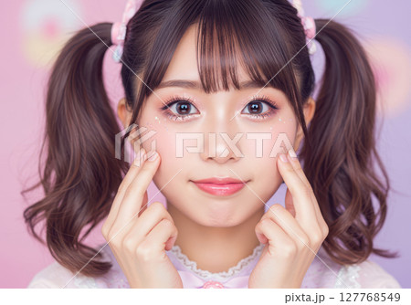 笑顔で両頬を指で押さえる可愛いツインテールの若い女性(AI生成素材)