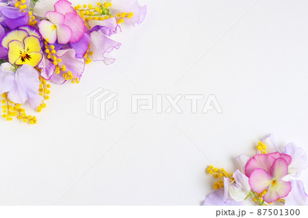 白背景に春の花の背景、クリスマスローズとビオラのフレーム