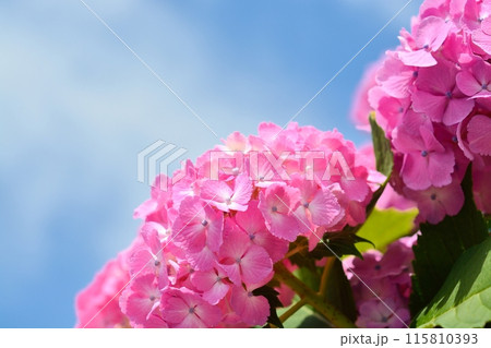鮮やかなピンク色のアジサイが緑の葉 | 季節のカードや花をテーマにしたデザイン、ガーデンイメージに