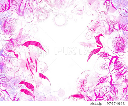 少女漫画風キラキラ輝く星々とピンクの薔薇と百合と花びらが舞うペン画カラーイラストと白背景