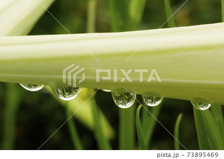 純白のテッポウユリ(鉄砲百合:高砂百合)に付いたしずく(雫,滴)に映り込む風景が面白い