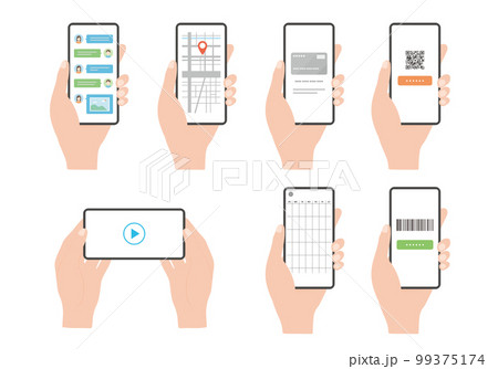 スマホを持つ手イラストとアイコン・スマホの画面いろいろセット