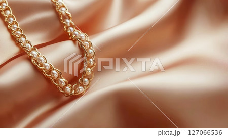 Gold chain adorned with pearls lies on smooth, peach fabric. Concept of elegance and luxury.