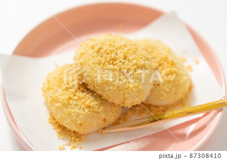 お皿に盛った青海苔入りのピーナッツ餅【白背景・切り抜き】