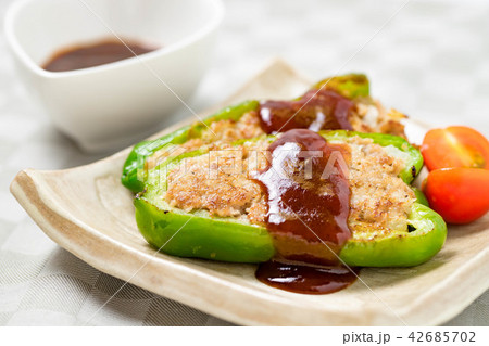 ピーマンの肉詰め。ピーマン、野菜と挽肉料理、ケチャップソース。