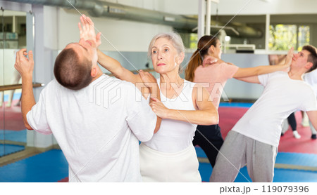 Woman self defense training gym learning to do painful grip