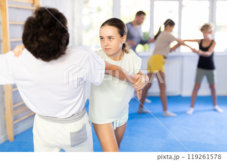 Sporty girls and boys are practices self-defence moves in pairs in gym.