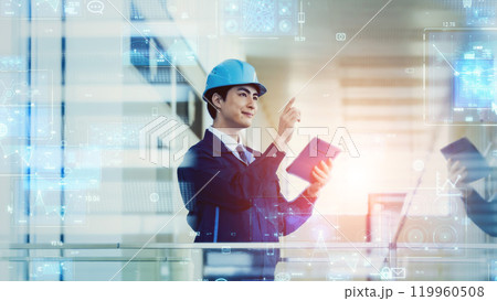 ノートパソコンを持って点検するミドルエイジ男性作業員の全身写真