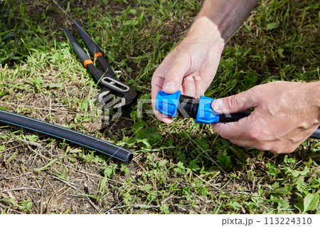 Installation of watering system from HDPE pipes, two parts of water supply are connected by coupling fitting with compression clamp on thread.