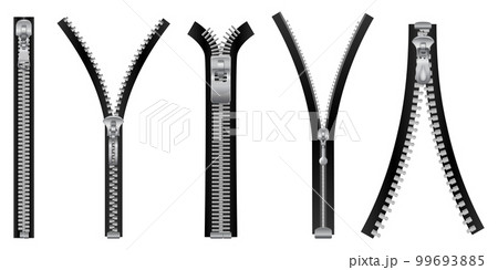 Metal zippers. Clothing fastener. Pull zip. Casual clothes accessories. Gold or silver objects. Fastening for fabric or apparel thread textile. Tailor sewing. Vector closed clasps set