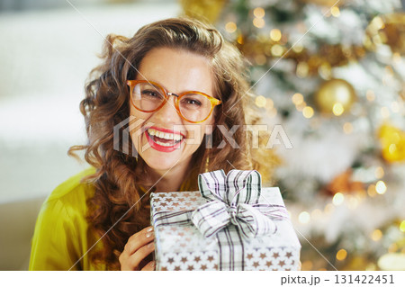 Close-up of Woman with Starry Christmas Gift