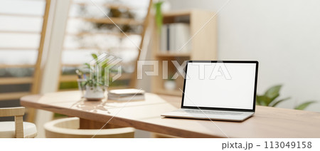 A white-screen laptop mockup on a wooden dining table in a neutral contemporary dining room.