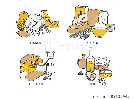 健康的な食生活に欠かせないもののセット 食物繊維、タンパク質、炭水化物、良質な油 ゆるい線画イラスト