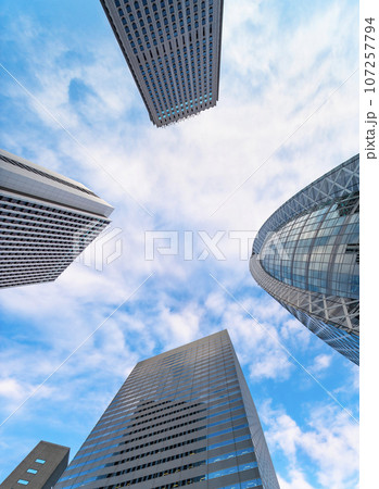 [東京・新宿] 青空に向かって目もくらむくらいに低角度から眺めた新宿の高層ビル群の光景。