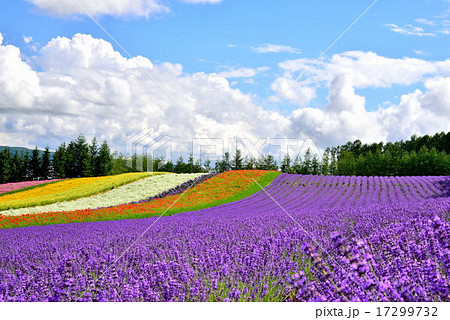 北海道 夏の青空 ラベンダー畑と彩りの風景