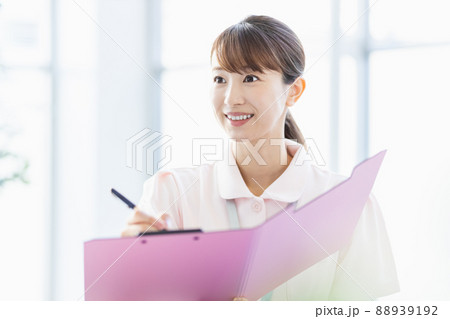 施設内でファイルと筆記用具を持つ医療従事者の女性