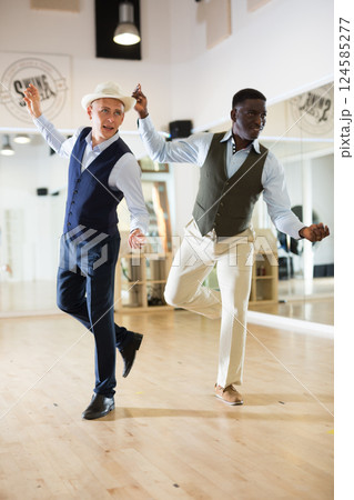 Active multinational men and women of different ages practicing Hip-hop dance in training hall during dancing classes