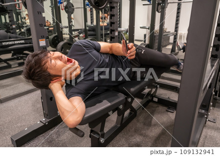 トレーニングをさぼって、あくびをしてスマホを見ている