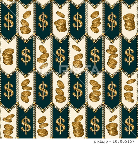 Chevron geometric pattern with gold realistic chains, dollar sign, stacks of one dollar coins, beads. Tile staggered seamless background. Classic elegance design.