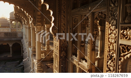 Indian archivolts, intricately carved with traditional motifs and exquisite inlays, shimmer in sunlight.