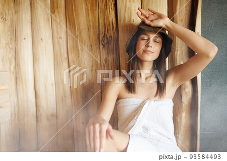Woman in a bath hat wrapped in a towel relaxes in a hot sauna