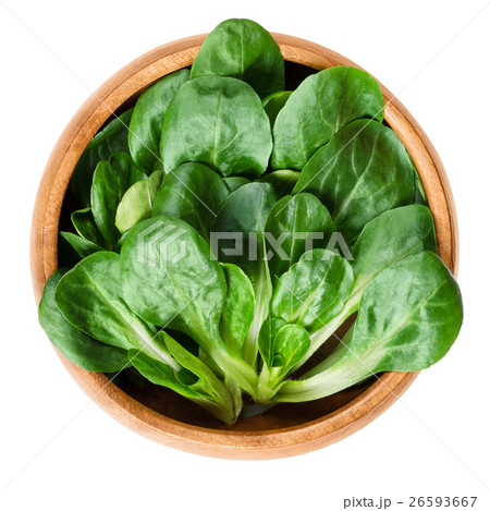 Fresh lambs lettuce, in a wooden bowl. Valerianella locusta, also known as common cornsalad, nut lettuce or field salad. Grows as small rosettes, has a nutty flavor, and is eaten as a leaf vegetable.