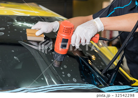 Transparent film, car paint protection, wrapping specialis. Car detailing. Selective focus.